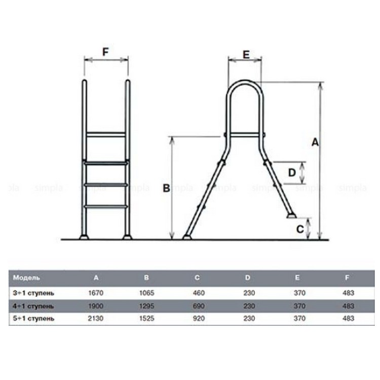 Лестница устанавливаются над бортом бассейна и не крепится к его основанию, что дает возможность установить ее в любом месте. Одна часть лестницы опирается на дно бассейна, другая на поверхность возле борта.
