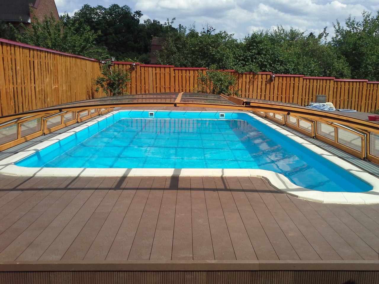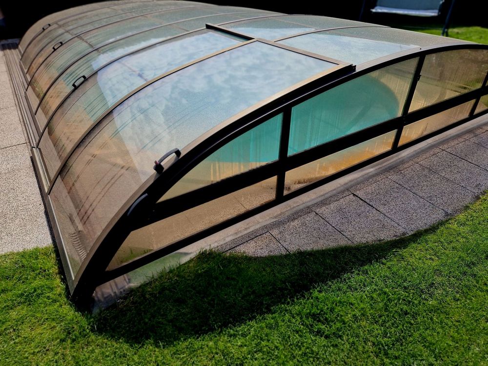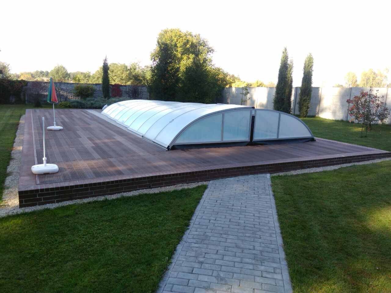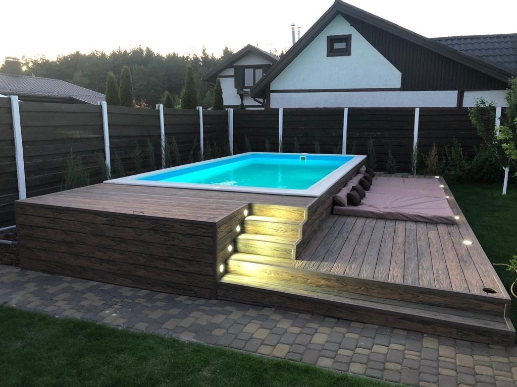 Можна встановити на ділянці готовий павільйон або купити накриття, що повторює контури басейну.